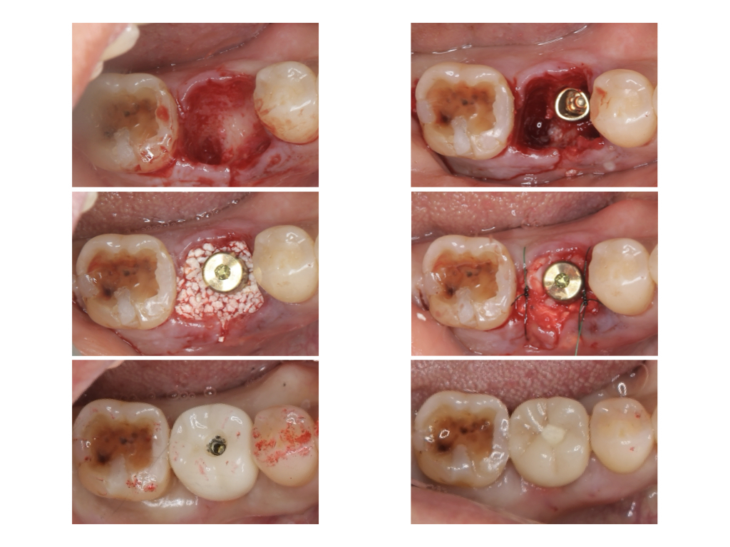 Step 1: 外科処置(抜歯・埋入・組織再生) 対象となる歯を抜歯すると同時に、インプラント体(フィクスチャー)の埋入を行います。その際、インプラント周囲の骨が不足している部分には「骨補填剤」を填入し、丁寧に縫合します。外科的侵襲を1回に集約することで、患部の回復を早めます。