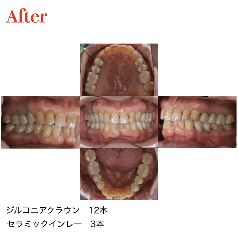 治療後の状態です。お口の中にあった全ての金属を取り除き、強度に優れた「ジルコニアクラウン」12本と、透明感のある「セラミックインレー」3本を用いて、白く健康的な口元へと生まれ変わりました。