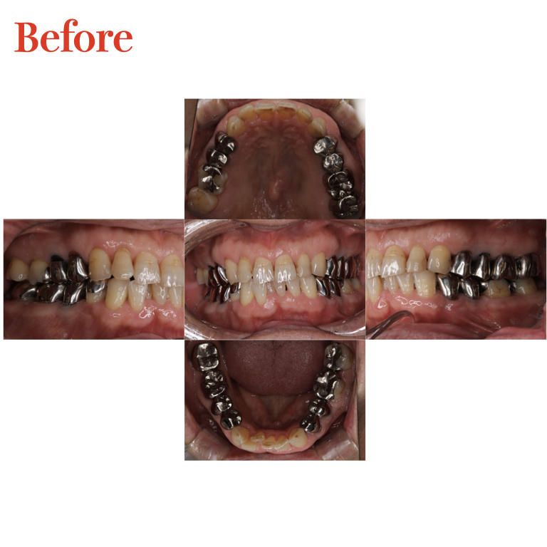 治療前のお口の状態です。奥歯を中心に、過去の治療による銀歯(金属の詰め物・被せ物)が多く見られます。