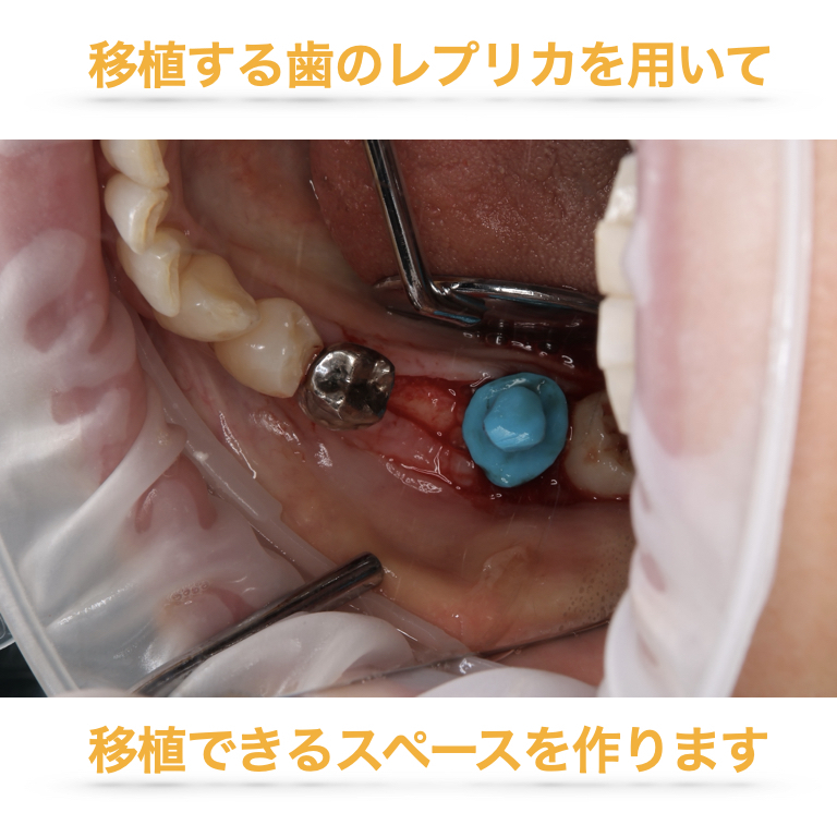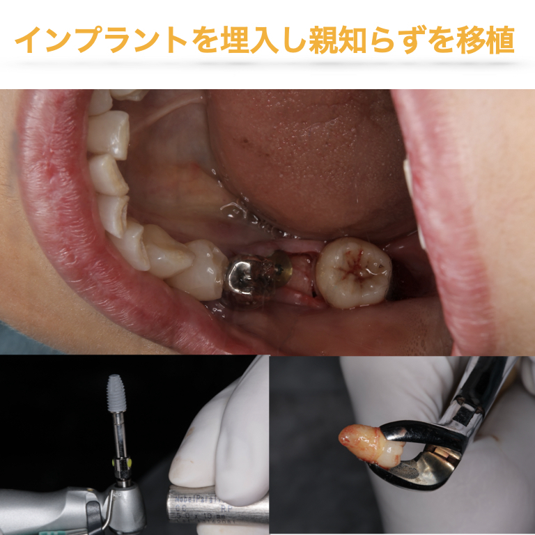 | 奥側(第2大臼歯部) | 自家歯牙移植 | 親知らずを移植。歯根膜(クッション)を維持でき、自然な噛み心地が得られます。 |